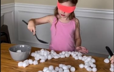 Setur fullt af bómul á borðið, hvert lið velur sér einn meðlim sem þreytir þrautina. Bundið fyrir augun á viðkomandi og safnar svo bómullarhnoðrum í skál þar til hún er full (eða allir fylli eins marga og þeir ná á 1 mín. heildartala tekin svo saman fyrir liðið). hér er notast við sleif/spaða/skeið til þess að safna kúlunum og það má ekki nota báðar hendur.