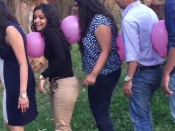 - Blaðran er svo sett fyrir aftan bak og liðsfélagi 2 stendur þétt upp að fyrsta þátttakanda til þess að halda blöðrunni á sínum stað (bannað að nota hendur)